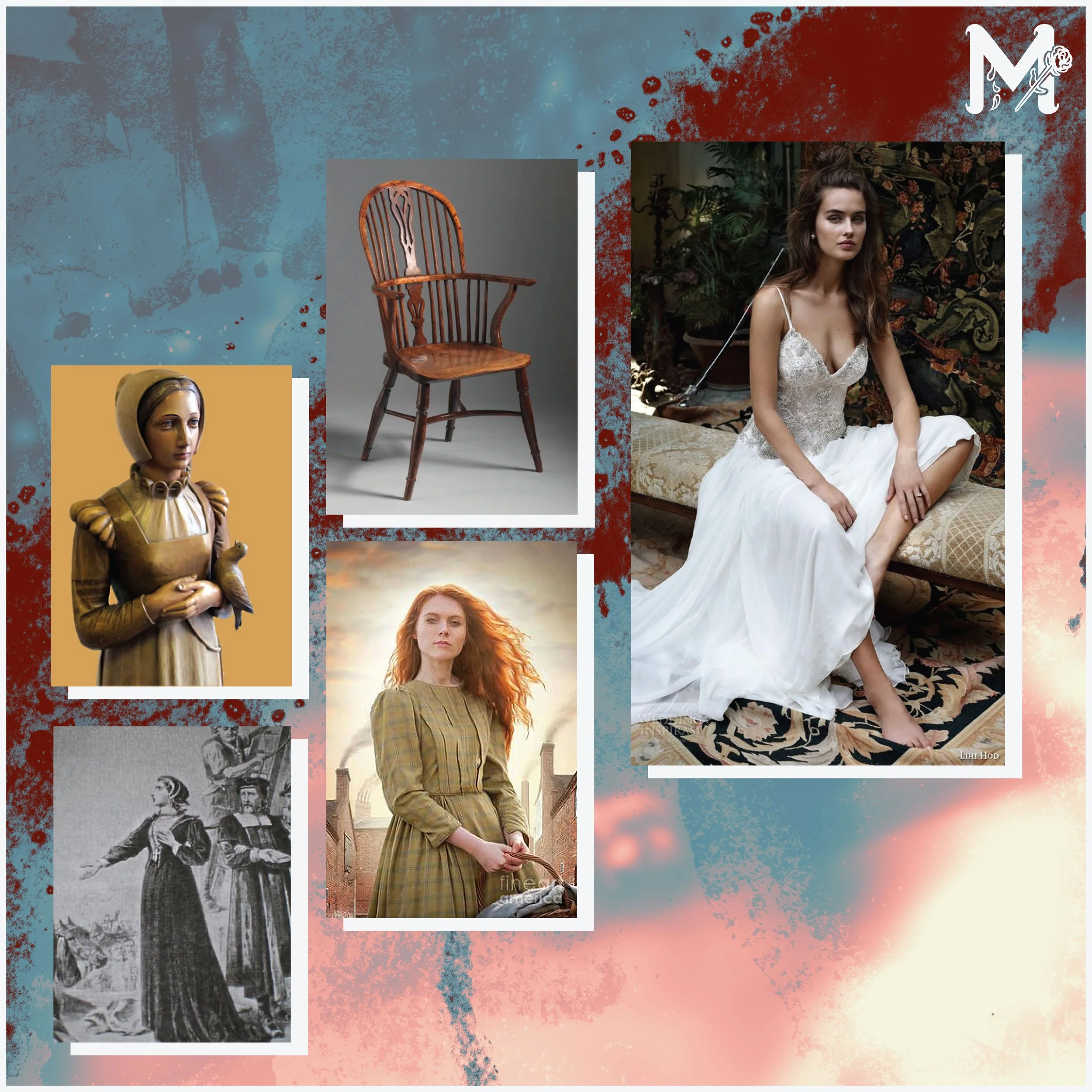 I referenced an assortment of images to make sure Anne had the proper clothing of an English woman, while honoring the rare saintly images of her. Finding a chair that felt old and intricate enough to resemble the wooden chair she was hanged in was a challenge.