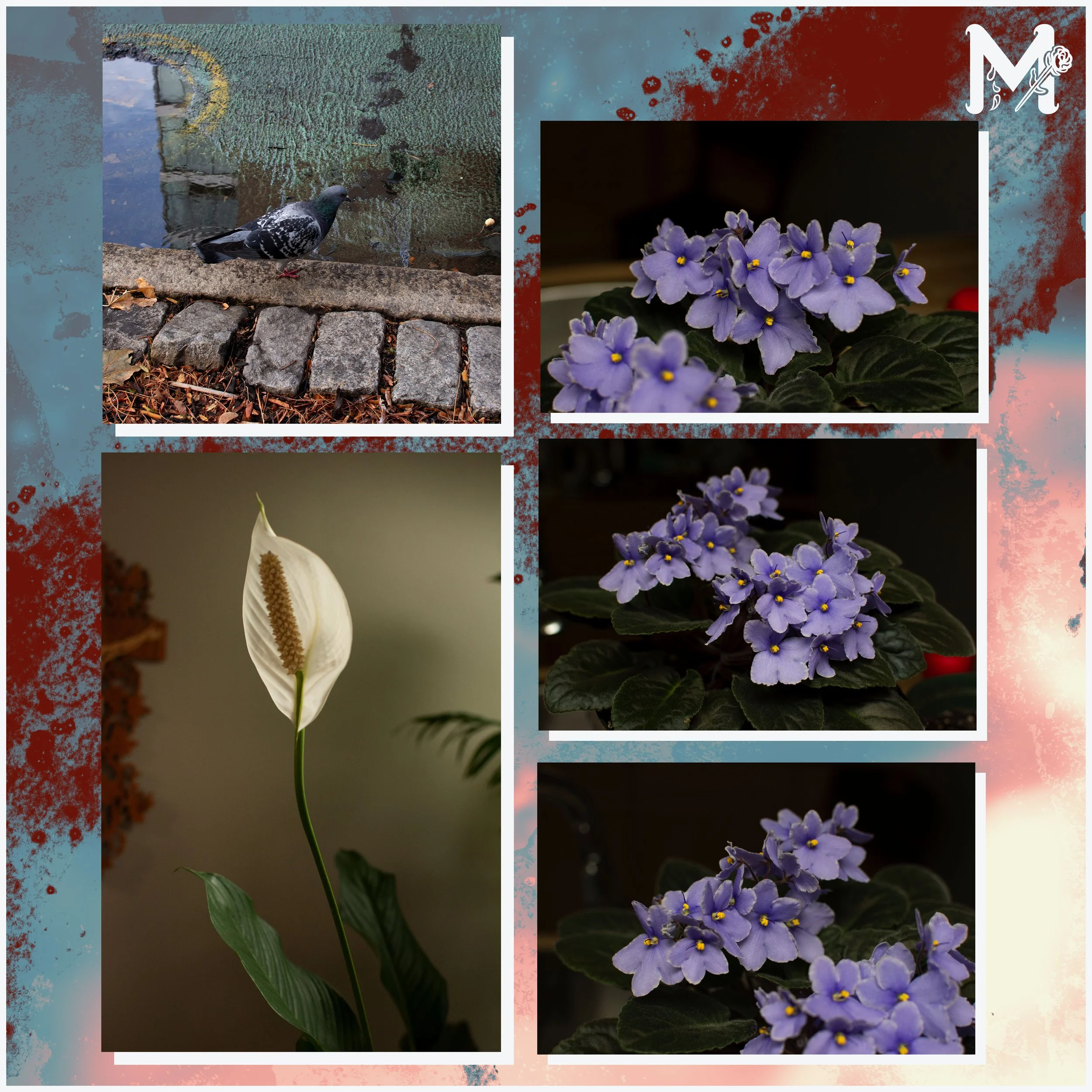 I rarely have an opportunity to have a pigeon stand still for my camera, and this one was perfect. The African violets and Peace Lily were taken in a friends parents’ home.