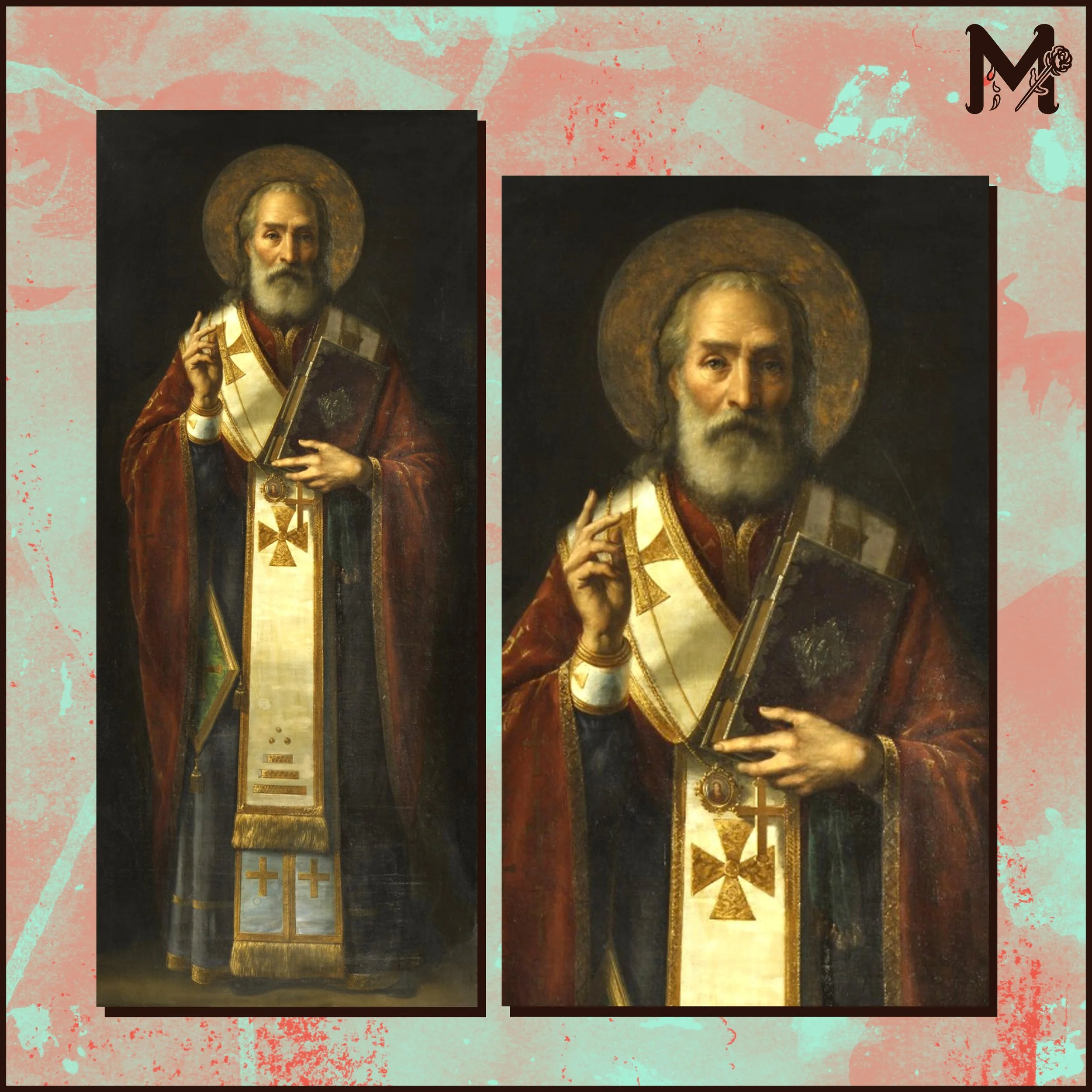 I took these photos at my church during the Christmas season. The poinsettia flowers allude to Christmas and fit nicely for Father Christmas himself, St. Nick.