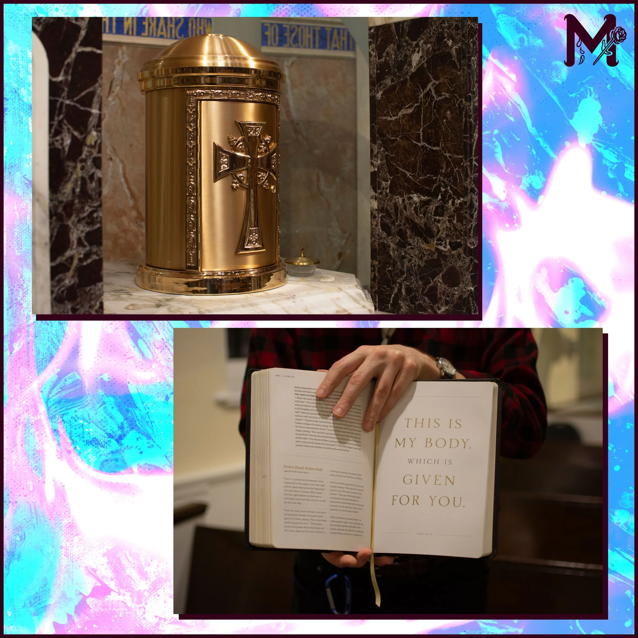 I went to my church and got this photo of the tabernacle so that Thomas could lean his sleeping head onto the real thing. My friend Sean modeled his hands holding his bible.